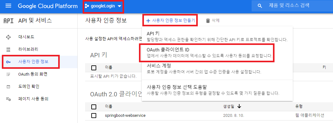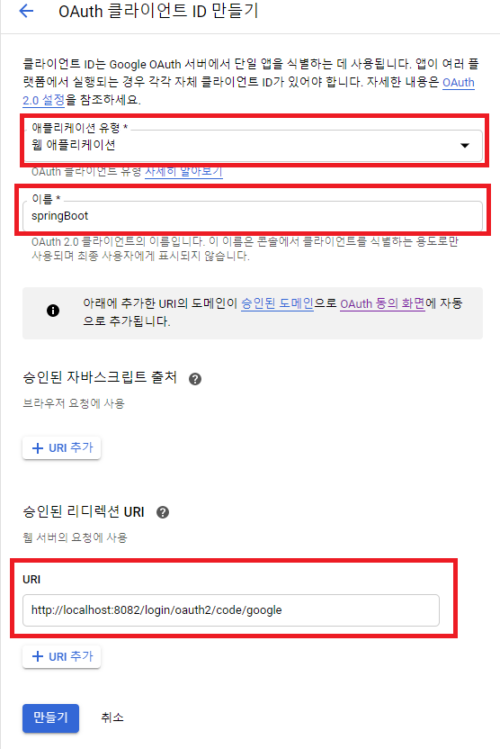 먼저 OAuth 동의 화면에서 이름 짓고 밑에 3개 잘 등록되었는지만 확인하고 생성