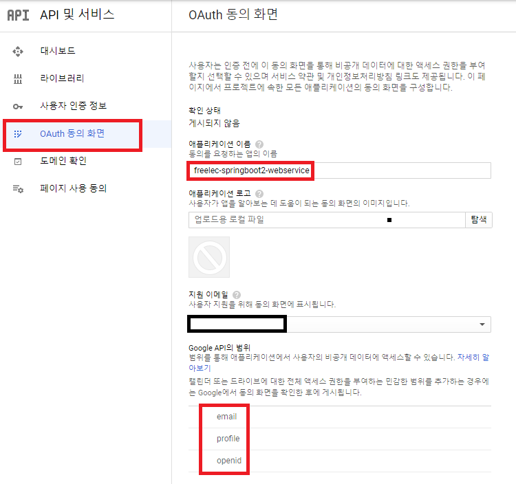 강제로 profile과 email을 등록한 이유는 openid라는 scope가 있으면 Opne id Provider로 인식하기 때문입니다. 이렇게 되면 OpenId Provider인 서비스(구글)와 그렇지 않은 서비스(네이버/카카오)로 나눠서 각각 OAuth2Service를 만들어야 하기 때문입니다. 무슨 소린지 모르겠죠? 일단 진행합시다 저도 어려워요 ㅋㅋ