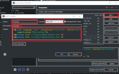 3. 템플릿을 만들것이라 new를 눌러준 후 이름과 설명은 자유롭게 작성하고 옆에는 New JSP로 해줘야한다.